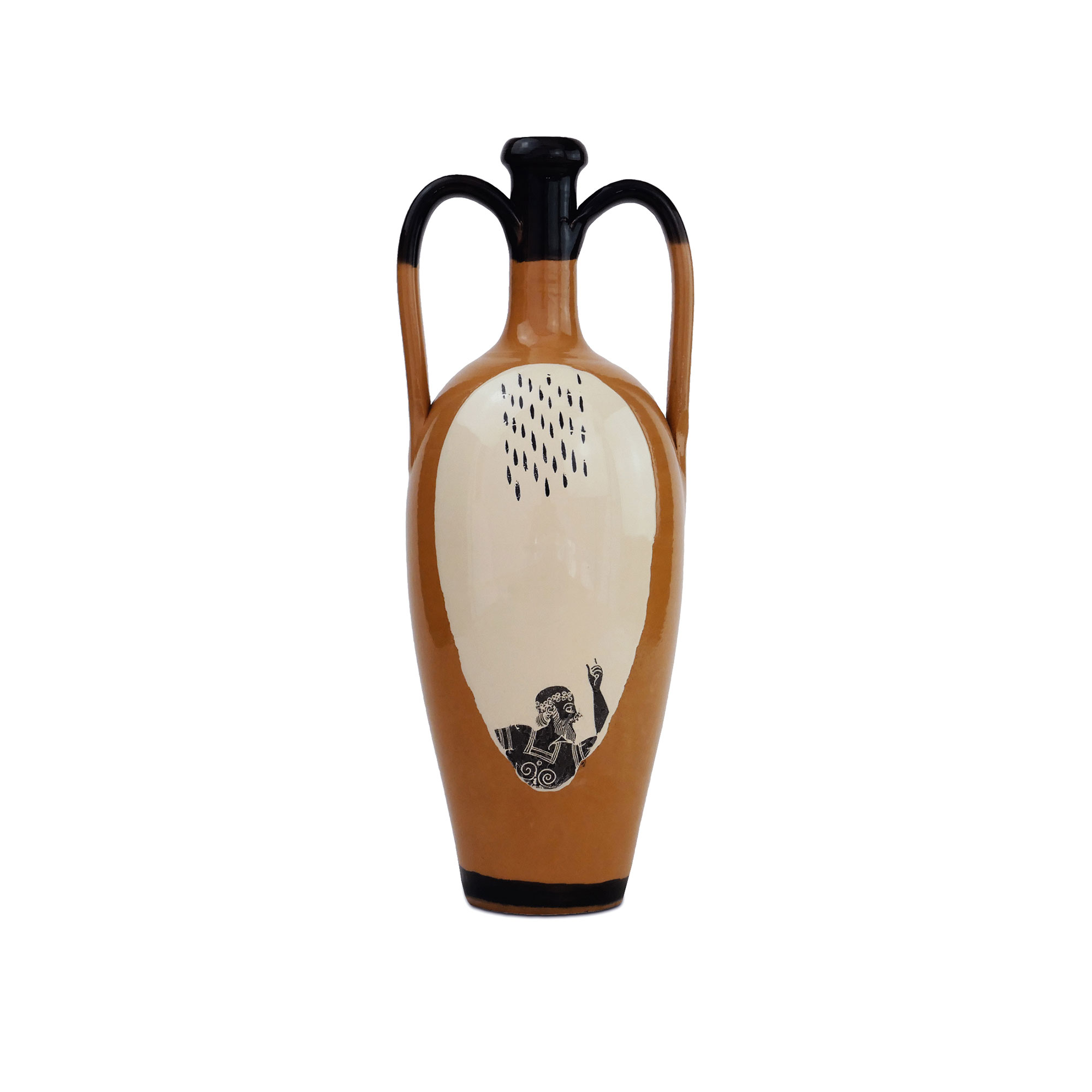 La serie di anfore “Magna Grecia” è costituita da pezzi unici, piccoli vasi in terracotta a due manici realizzati e decorati a mano attraverso varianti grafiche applicate con la tecnica della decalcomania. La collezione si contraddistingue per i riferimenti alla cultura dell’antica Grecia, attraverso porzioni decorative che riprendono la tradizione della pittura vascolare con riferimenti a personaggi e scene della mitologia.